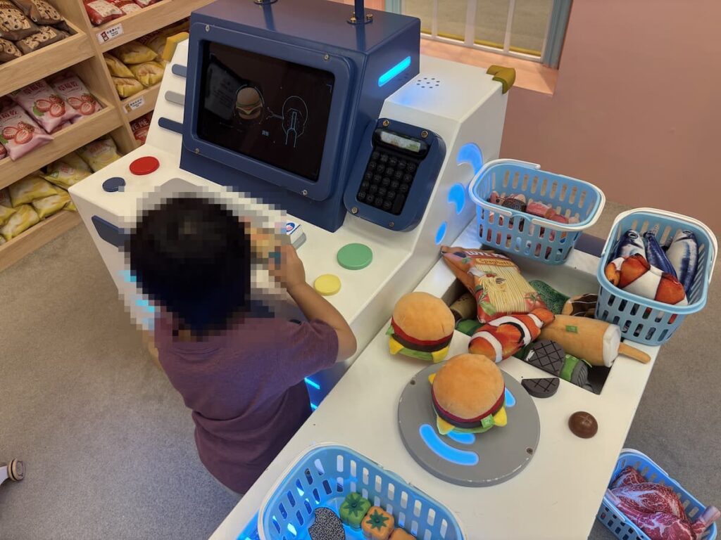 実際のキッチンやレジが並ぶようなリアルな空間で、子どもたちはシェフやお店屋さんになりきって遊べます。