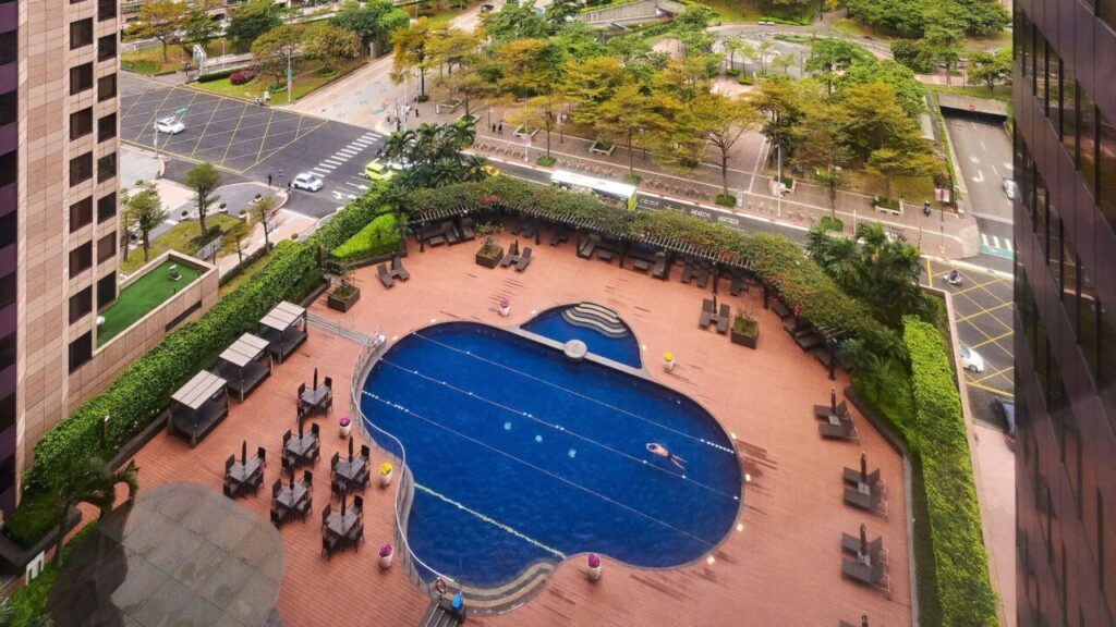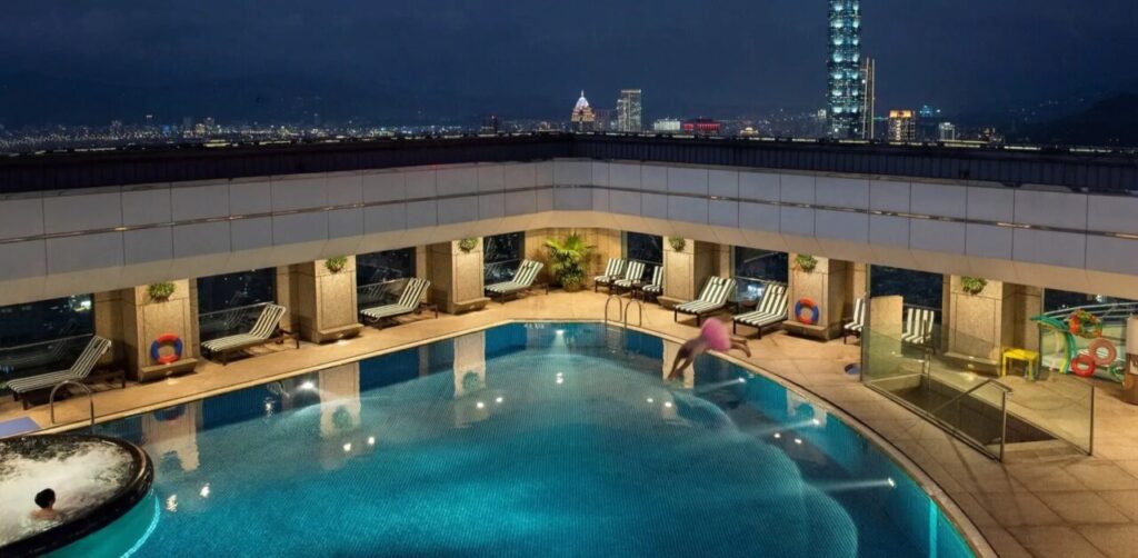 屋上に近い高層階にあるプールは開放感があり、台北市内を一望できます。リージェントと同じ中山エリアにありながら、マリオット会員特典が使える点や施設の広さで差別化されています。ファミリーでのリピーター利用も多く、スタッフの子ども対応も丁寧です。